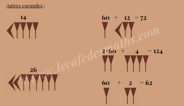 Ainsi, selon sa position, un symbole peut représenter une unité, une soixantaine ou une soixantaine de soixantaines. Pour les nombres de 11 à 59, on combine des répétitions de clous et de chevrons (principe additif), tandis que le 60 est représenté par le clou en position supérieure (principe positionnel). Voici quelques exemples :