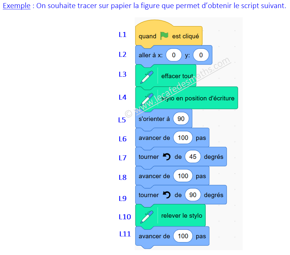 - b) Compléter ce script pour que le lutin trace un triangle isocèle rectangle.